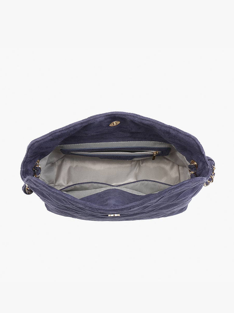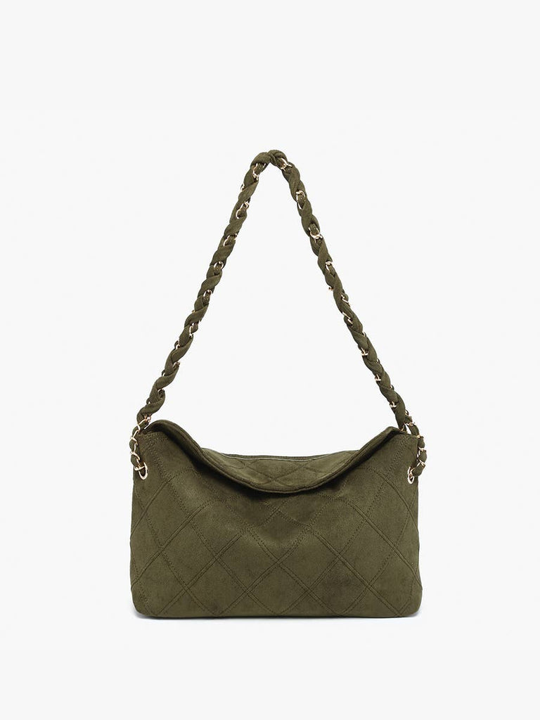 Item Details: -Faux Suede Quilted Design: Provides a rich, textured look with a touch of elegance. -Snap Closure: Ensures your belongings are securely stored. -Back Zip Pocket: Offers convenient additional storage. -Braided Strap with Chain: Adds a stylish and sophisticated detail. Dimensions: -Length: 14.5 inches -Height: 8.5 inches -Depth: 4 inches The Dominique Faux Suede Quilted Shoulder Bag with Braided Chain is ideal for those seeking a chic and functional accessory that effortlessly enhances both casual and formal outfits, perfect for adding a touch of elegance to your fall wardrobe.