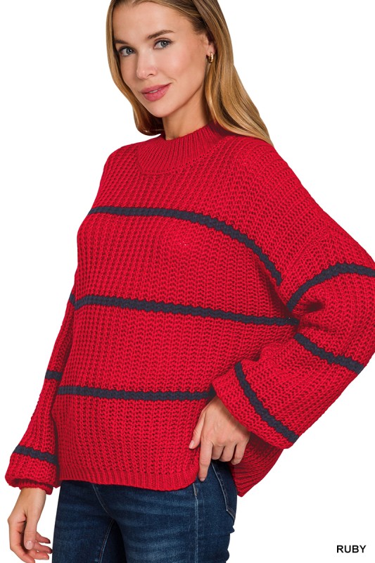 Pair this cute, oversized, striped sweater with your favorite jeans for a