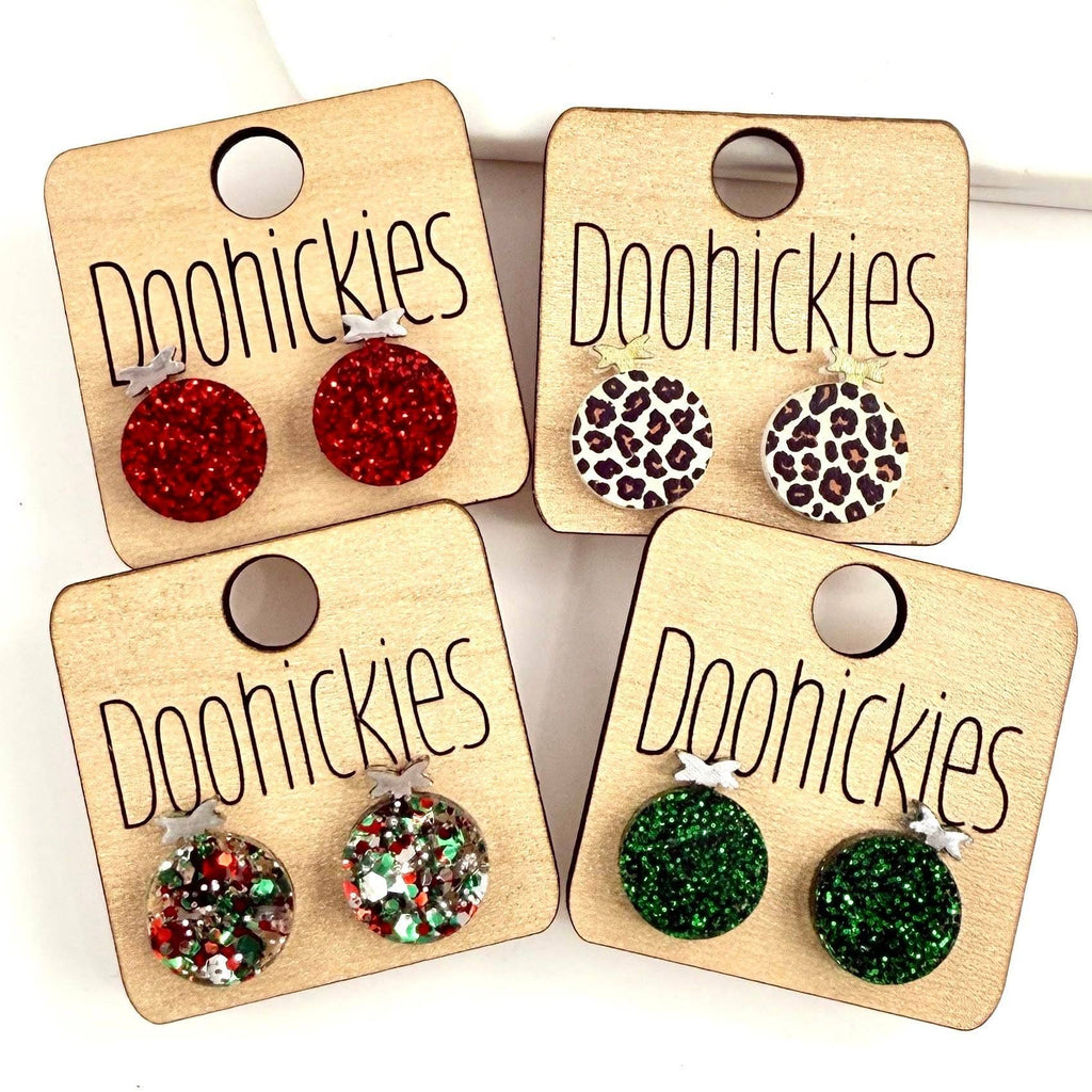 Deck your ears with festive sparkle! These adorable glitter Christmas ornament stud earrings bring holiday cheer in four dazzling styles: leopard print, classic Christmas glitter, vibrant red glitter, and cheerful green glitter. Perfect for adding a touch of seasonal fun to any outfit, these lightweight studs are comfortable enough for all-day wear. Whether you're heading to a holiday party or just spreading Christmas spirit, these eye-catching earrings are sure to get compliments. Mix and match your favorites or gift them to fellow holiday enthusiasts! Dimensions: 15mm x 13mm Settings Type: Stainless Steel & Hypoallergenic ** All settings are lead and nickel free** Materials: Acrylic