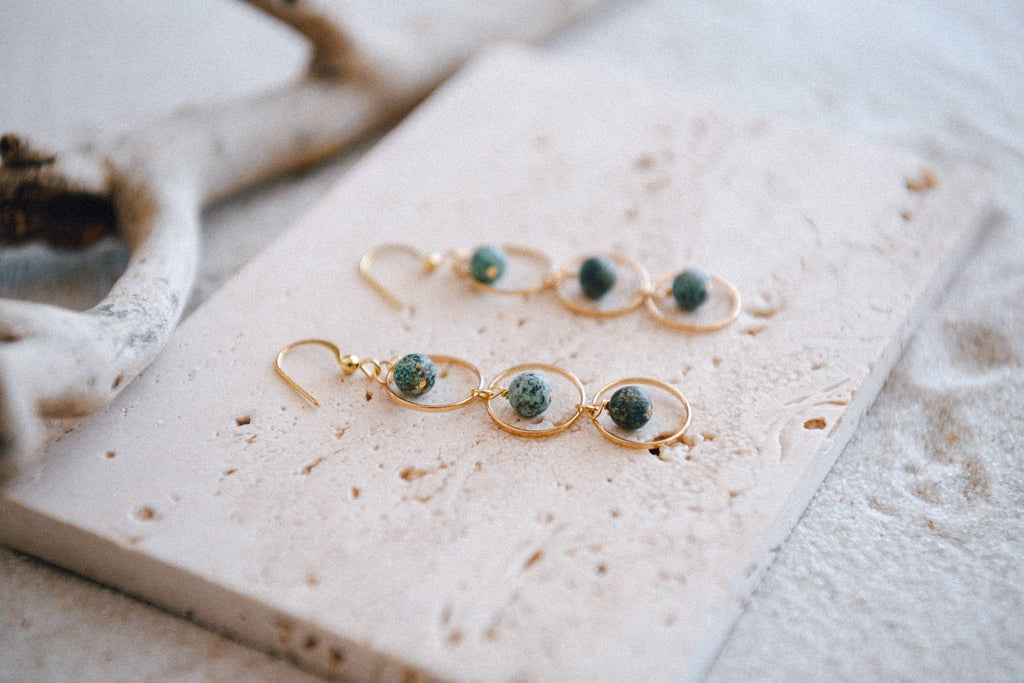 Featuring delicate gold hoops linked together with natural beads, these lightweight earrings offer a boho-chic yet refined style. Perfect for everyday wear or dressing up a special occasion outfit.