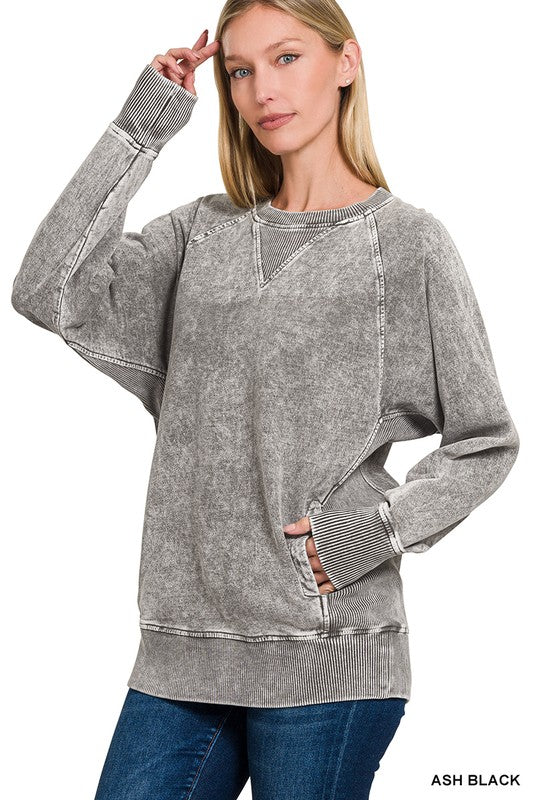 Pair this adorable, snow washed, French Terry pullover with your favorite jeans for a stylish look!